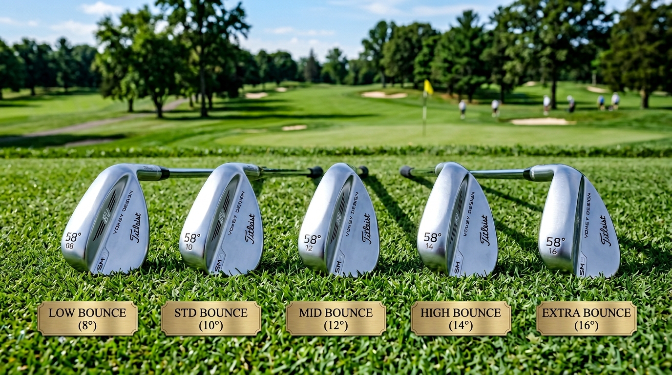 58度ウェッジでは、バンス角は一般的に8〜14度程度のバリエーションが用意されています。
