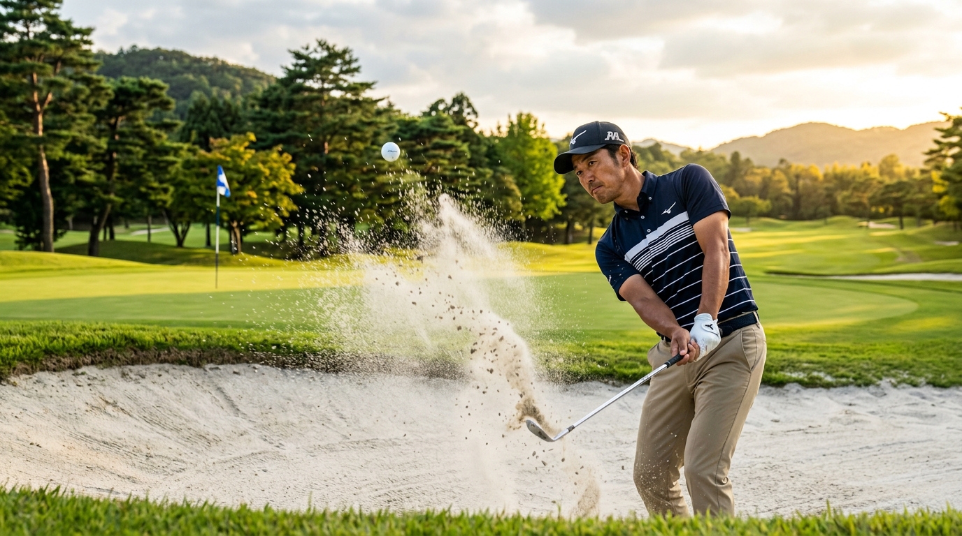 バンカーで58度を使う際は、「砂を爆発させてボールを浮かせる」イメージで振り抜くことが大切です。