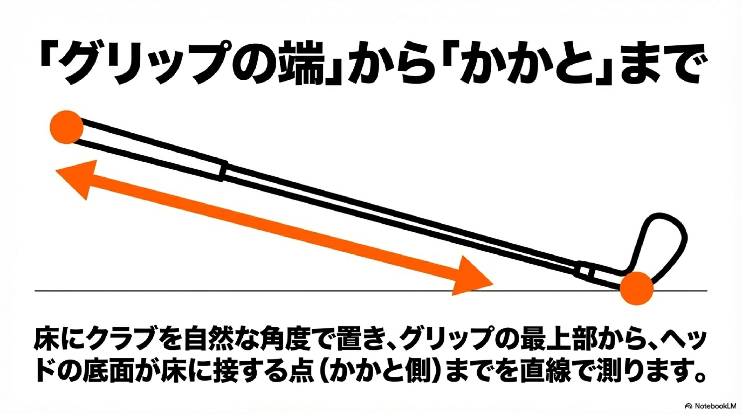 ・クラブ長はグリップエンド→ヒール接地点(ライ角固定状態)で測る