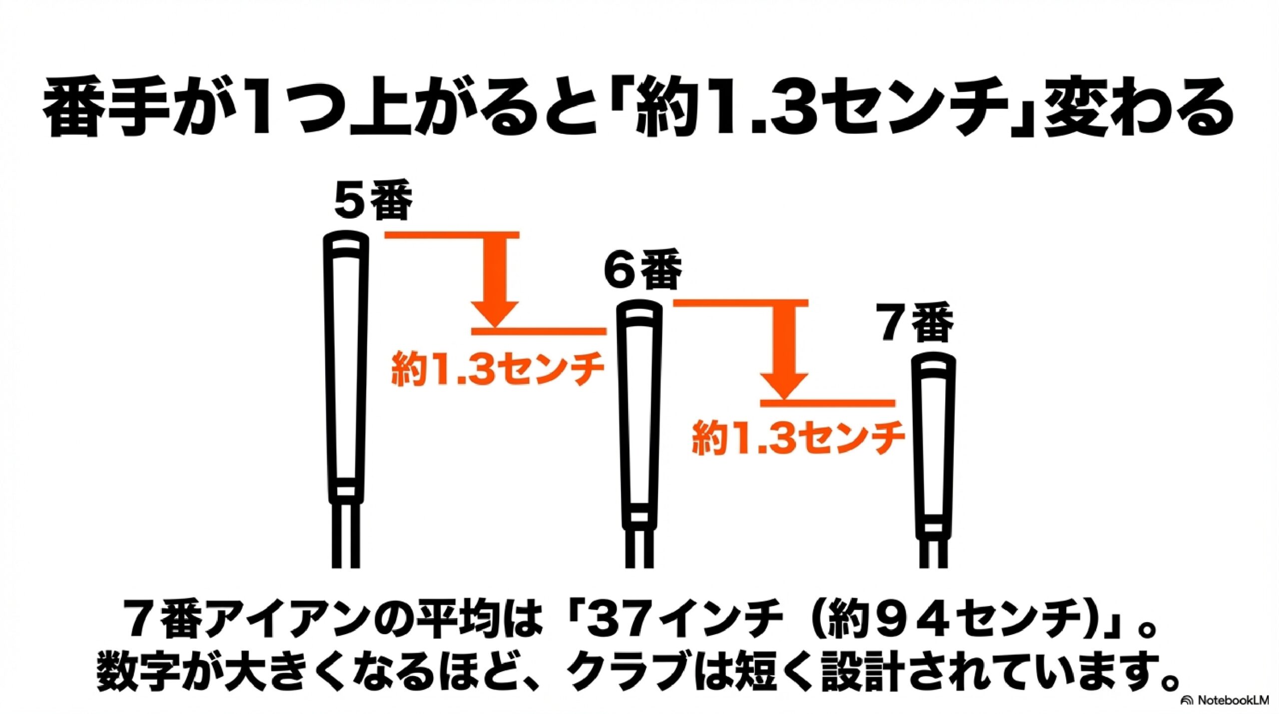 アイアンは番手が大きくなるほど(数字が大きくなるほど)クラブが短くなります。1番手の差がおよそ0.5インチ(約1.3cm)ずつ変わるのが一般的な設計です。